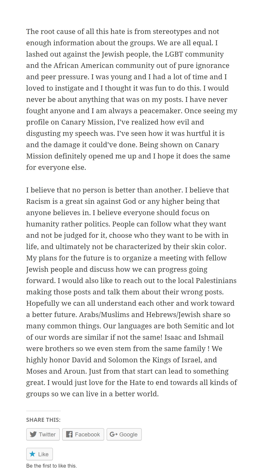 The root cause of all this hate is from stereotypes and not enough information about the groups We are all equal...Being shown on Canary Mission definitely opened me up and I hope it does the same for everyone else.