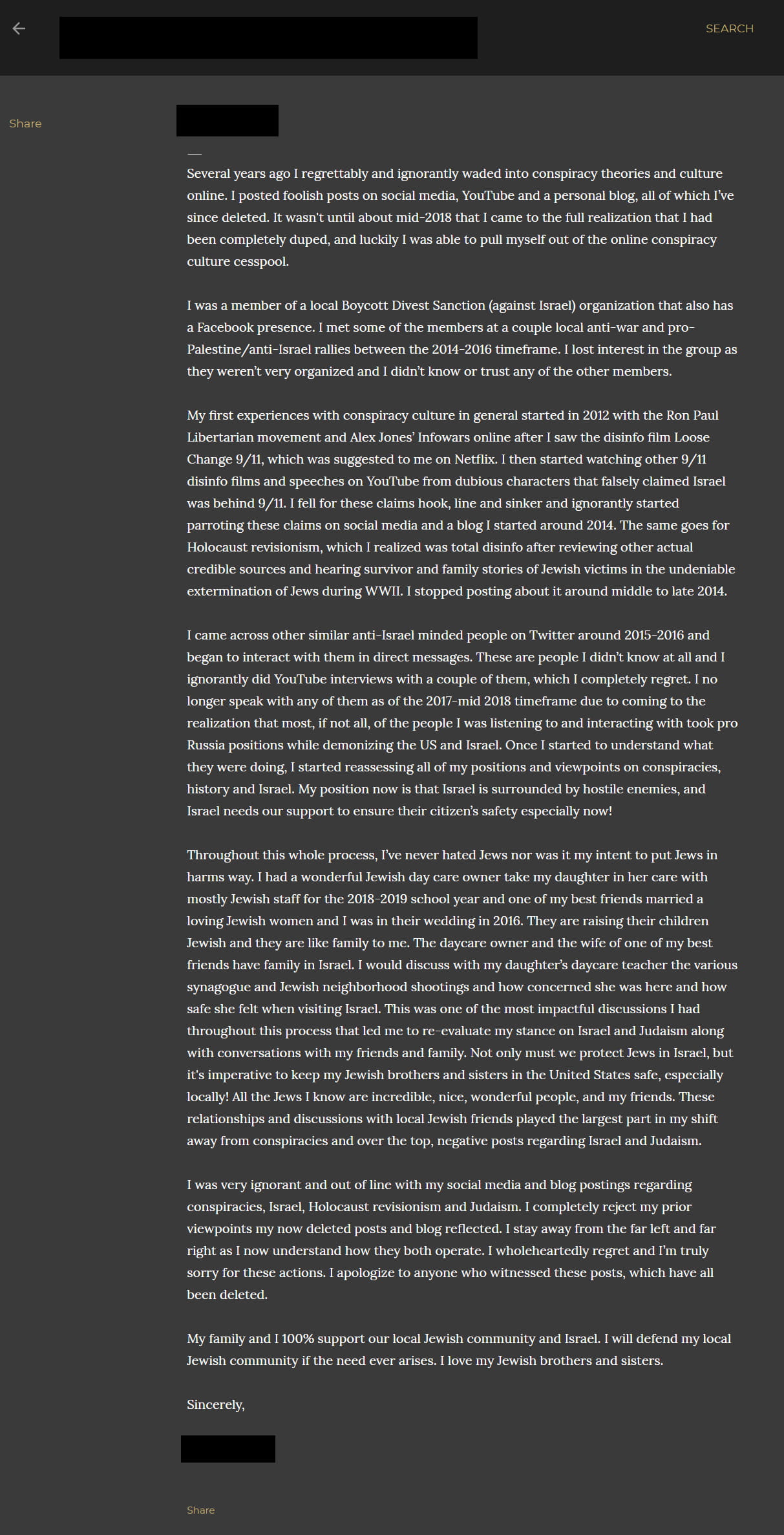 My first experiences with conspiracy culture started in 2012 with...Alex Jones’ Infowars. I fell for these claims hook, line and sinker and ignorantly started parroting these claims on social media and a blog I started around 2014.