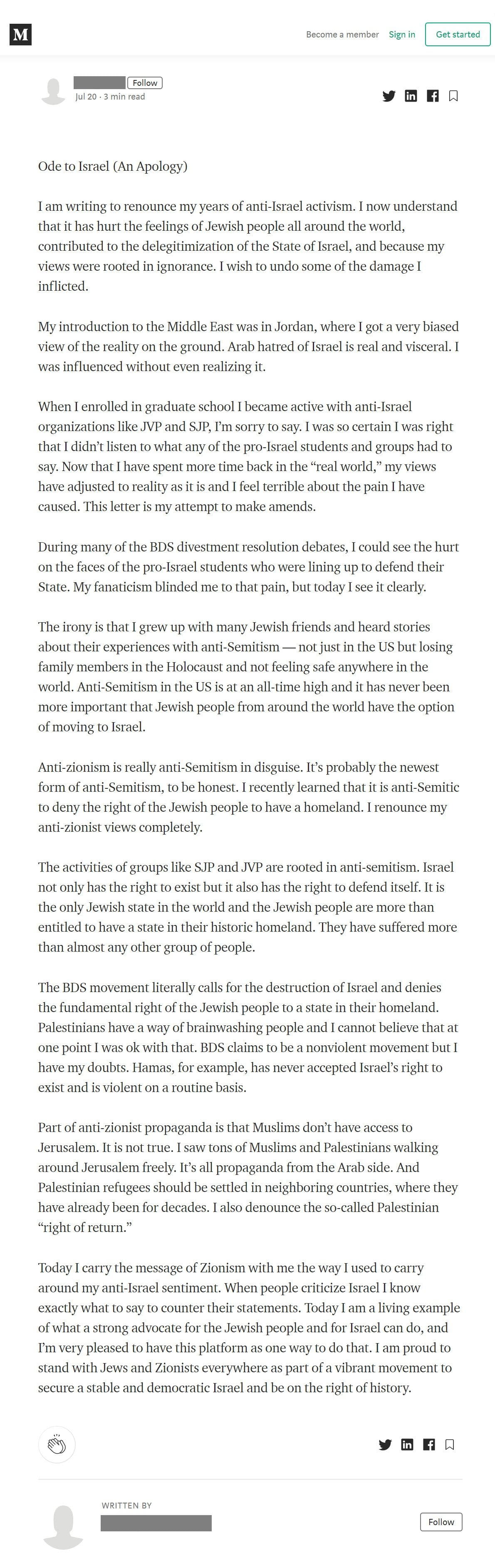 Anti-zionism is really anti-Semitism in disguise. It's probably the newest form of anti-Semitism, to be honest. I recently learned that it is anti-Semitic to deny the right of the Jewish people to have a homeland. I renounce my anti-zionist views completely and am sorry for the feelings I have hurt.