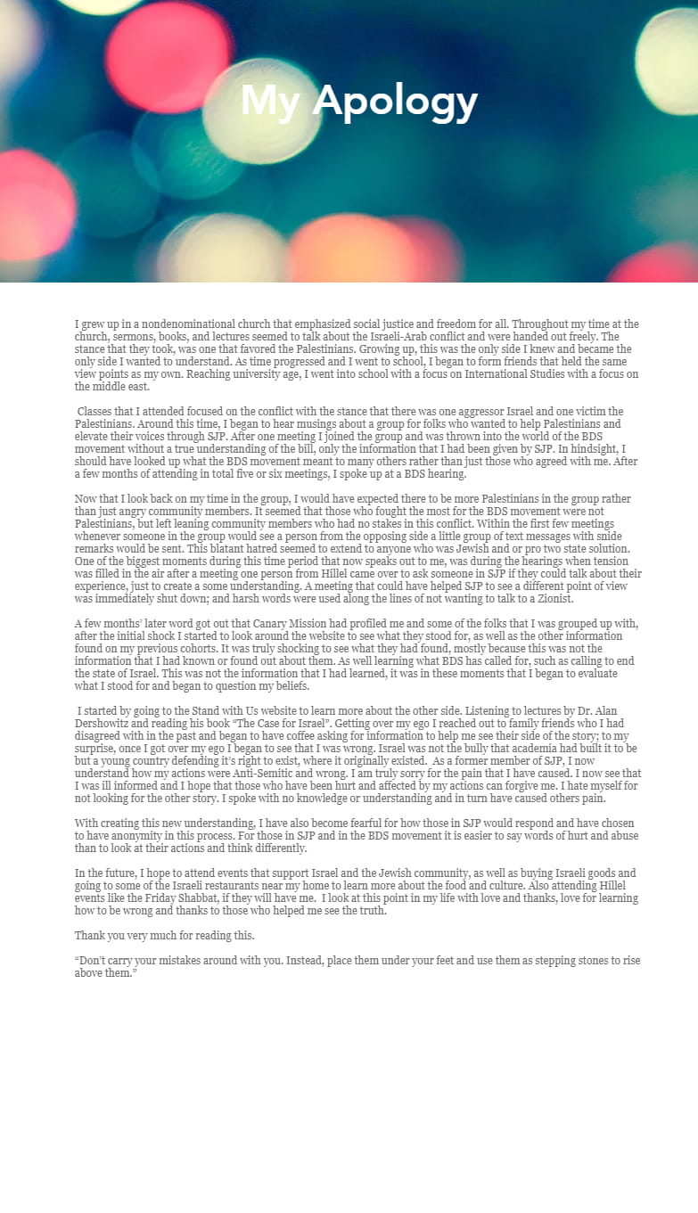 As a former member of SJP, I now understand how my actions were Anti-Semitic and wrong. I am truly sorry for the pain that I have caused. I now see that I was ill informed and I hope that those who have been hurt and affected by my actions can forgive me. I hate myself for not looking for the other story. I spoke with no knowledge or understanding and in turn have caused others pain.