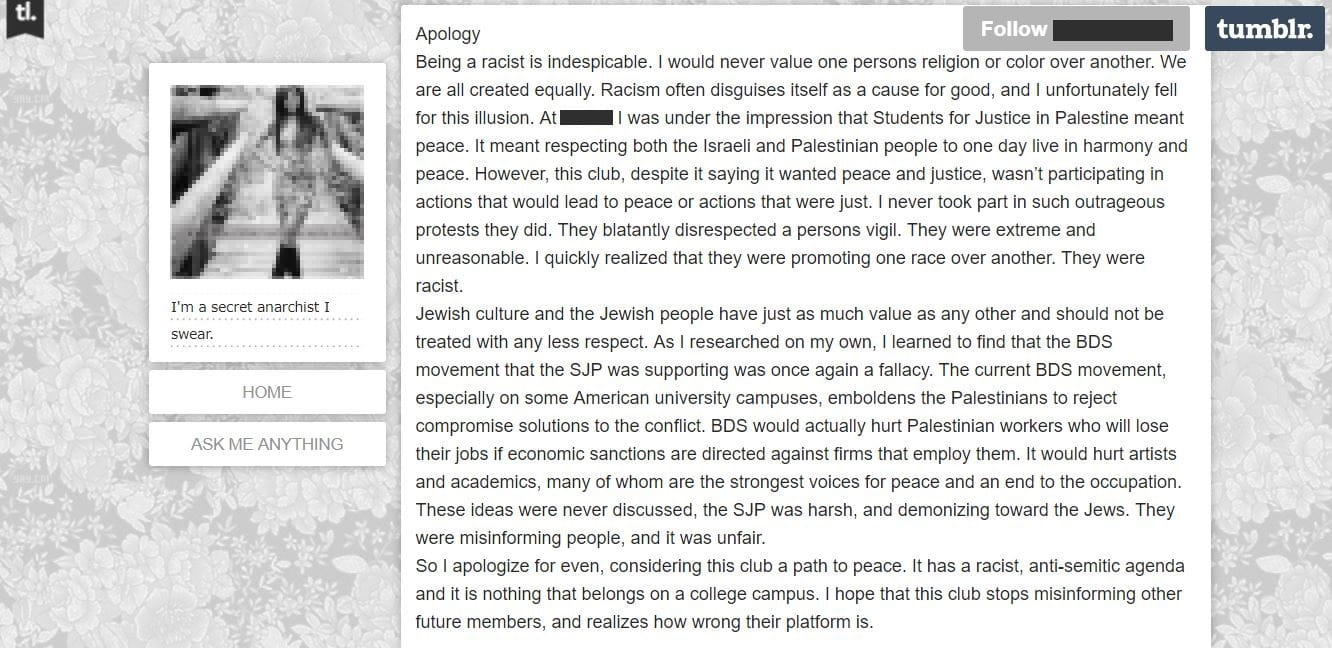 I️ apologize for even, considering [SJP] a path to peace. It has a racist, anti-semitic agenda and it is nothing that belongs on a college campus.