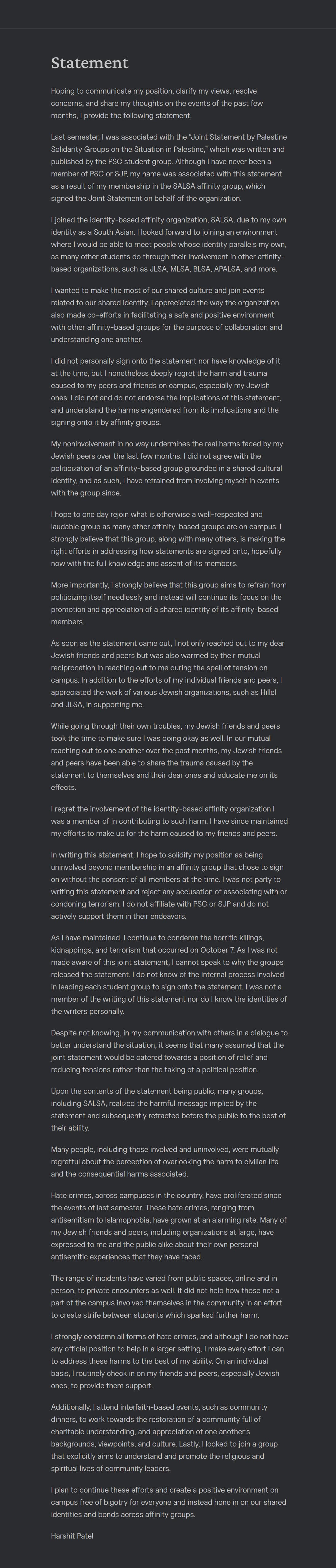 I regret the involvement of the identity-based affinity organization I was a member of in contributing to such harm. I have since maintained my efforts to make up for the harm caused to my friends and peers.